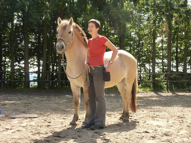 Ansonsten hatten wir heute schon mal Sonne und Wärme, was sehr angenehm war. Der Tag begann mit der Erkärung von Loopy-training (nur ein kurzer Einblick), dann gingen wir mit Jack auf den Reitplatz und Franzi arbeitete an GrownUps, was überging in Kopfsenken und noch mehr, was ich nicht so mitbekommen habe, weil ich Mirko nebenbei auf dem Reitplatz beschäftigt hab. Achja, stimmt, es ging um Cues - Hinweise/Signale, und das Trainieren davon bzw einbauen. Das neue Signal für Kopfsenken war "Hand heben", das alte die Position des Stehens im Unterschied zu GrownUps (daneben stehen, Hände zusammen vor dem Bauch).