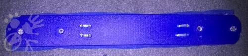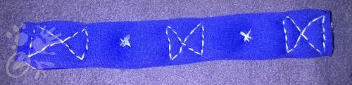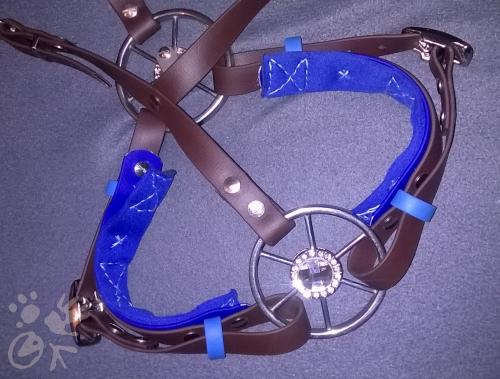 Die hab ich aus dem dünnen Biothane-Stück gemacht. In beide Ende zwei kleine Löcher mit der Lochzange, und dann durch die Löcher genäht. Und am Nasenriemen ist links und rechts jeweils ne Schraube, da klemmen sie zwischen dem blauen und dem braunen Biothane.