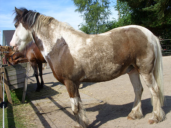 Nuance, Engl. Vollblut (vor einigen Jahren verstorben), ca. 158 cm, damals zu dünn, voll ausgewachsen: 410 kg