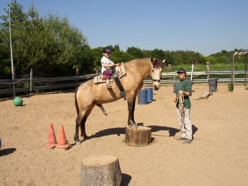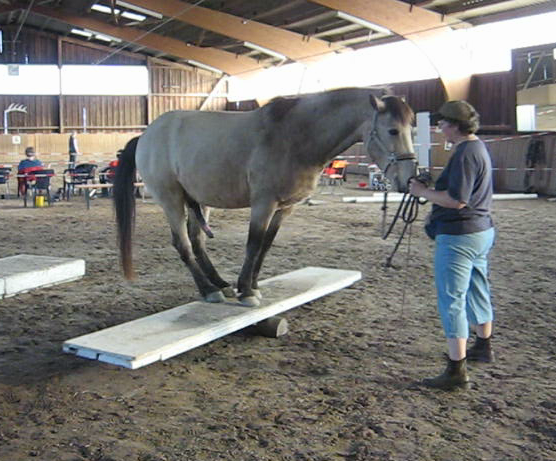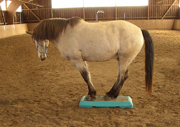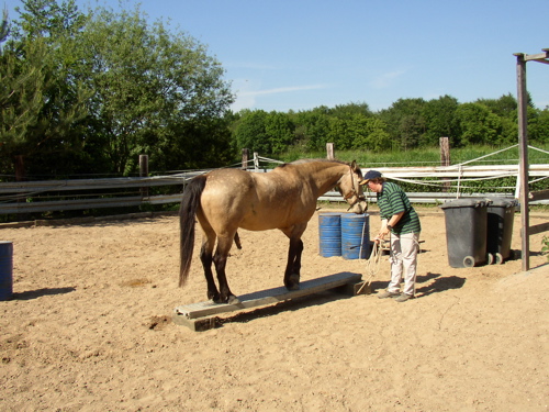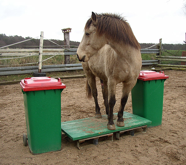 Neben den immer kleiner werdenden Plätzen kann man auch hinter einer Markierung für die Vorderbeine shapen. Also z.B. eine Holzlatte oder eine Gerte auf den Boden vor die Vorderhufe legen. An dieser "Begrenzung kann man das Pferd locken. Man clickt dann immer für das Verlagern des Gleichgewichts und dafür, dass es hinter der "Begrenzung" bleibt.