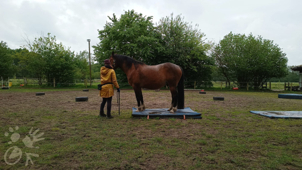 Damit war ich dann fast etwas überfordert. Wir haben dann versucht das Traben mit Click an der Stange und dann Futterpunkt einige Meter hinter der Stange – da hatte ich aber etwas einen Knoten im Kopf, dass ich ja eine „Abkürzung“ gehen kann dabei. Das war insgesamt ein sehr spannender Aspekt, dass Marlitt die Distanz (oder Kriterien) relativ „schnell“ erhöht hat – aber immer auf einem Level der für die Pferde noch fein war, und wenn nicht ging es einen Schritt zurück. Aber es hat sich immer alles so „flüssig“ angefühlt.